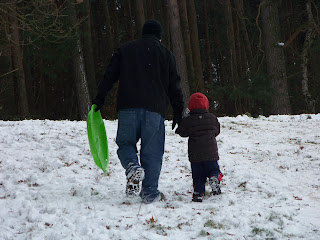 It snowed all weekend here. I do not like snow, but Noah of course loves it. Last winter we were told they had NO snow.....This year it is snowing early, just our luck. Noah of course wanted to play in it, so this morning, David took him sledding. The pictures speak for themselves. He didn't want to stop, but the wind was blowing pretty hard and I was cold and so was he. We don't have a snow suit for him yet, so it looks like that is going to be the next purchase......
